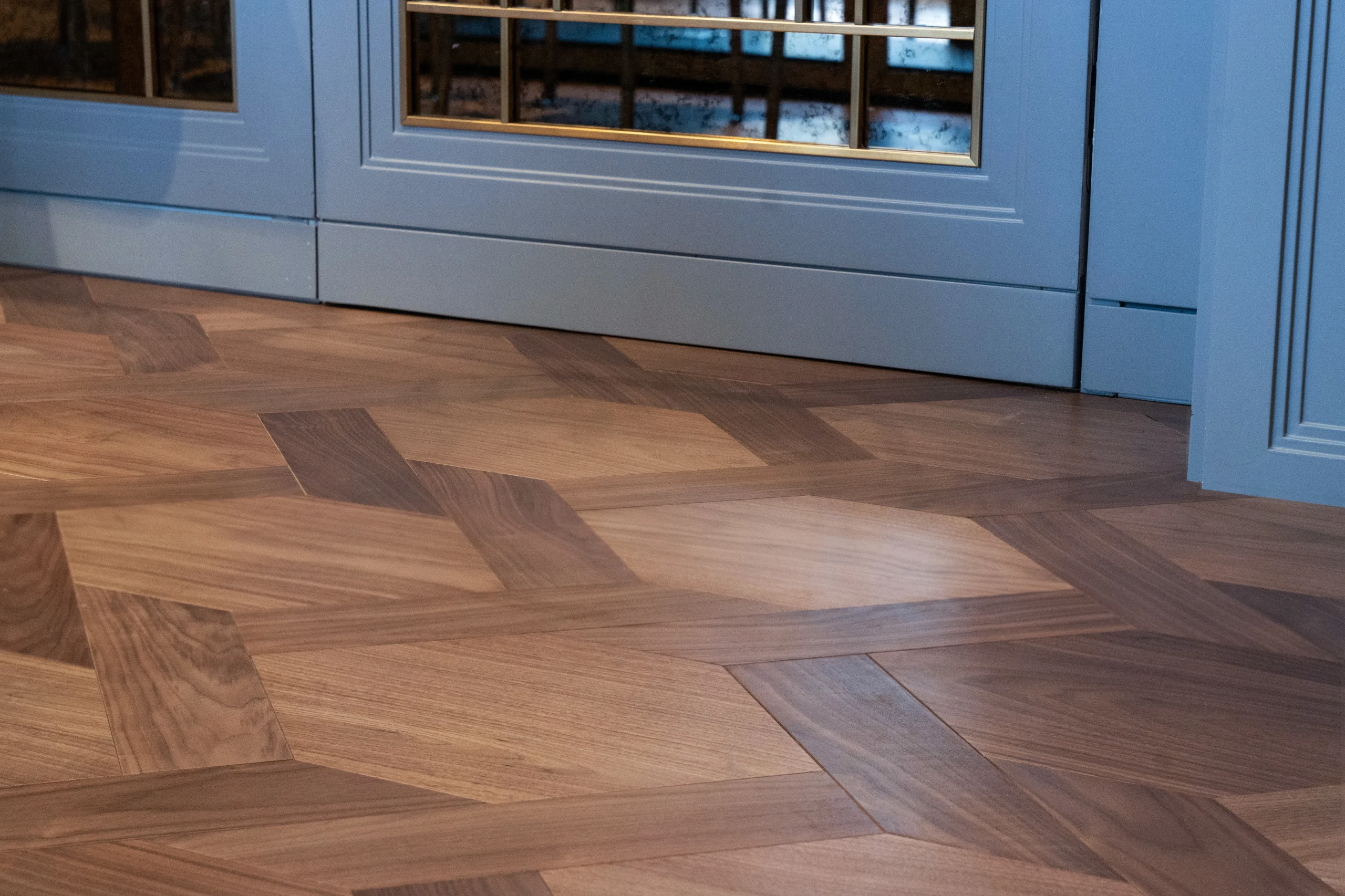 Tương tự xương cá nhưng các đầu gỗ được cắt vát góc 45 độ, tạo nên sự liền mạch hoàn hảo. Chevron thường được dùng trong các biệt thự, khách sạn hoặc phòng khách lớn theo phong cách Art Deco. - Lát sàn họa tiết hình học