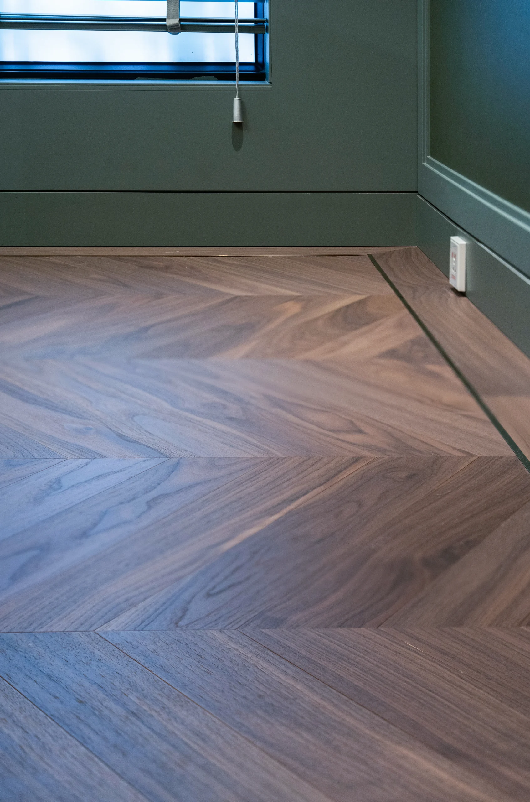 Mẫu lát sàn xương cá là lựa chọn kinh điển của phong cách Art Deco. Các thanh gỗ được lát đan chéo, tạo thành các mũi nhọn hình chữ V liên tục. Kiểu lát này mang đến cảm giác tinh tế, cổ điển và có chiều sâu cho không gian. - Lát Chevron