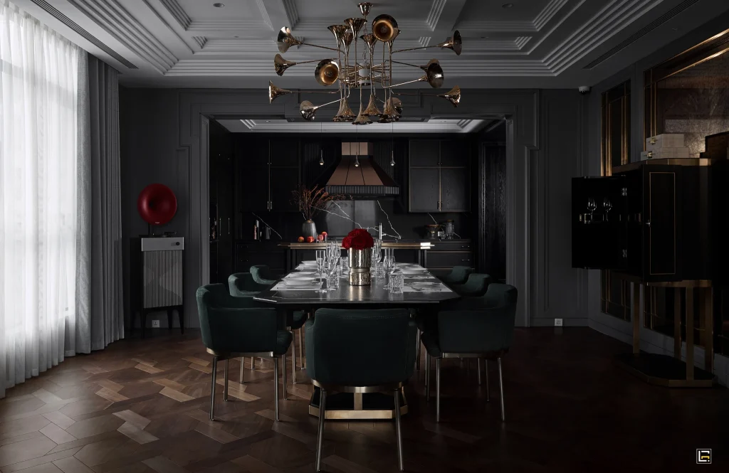 - Khả năng kết hợp linh hoạt: Sàn gỗ dễ dàng kết hợp với các chi tiết nội thất Art Deco khác như bàn ghế mạ vàng, gương lớn hình học, đèn chùm pha lê.